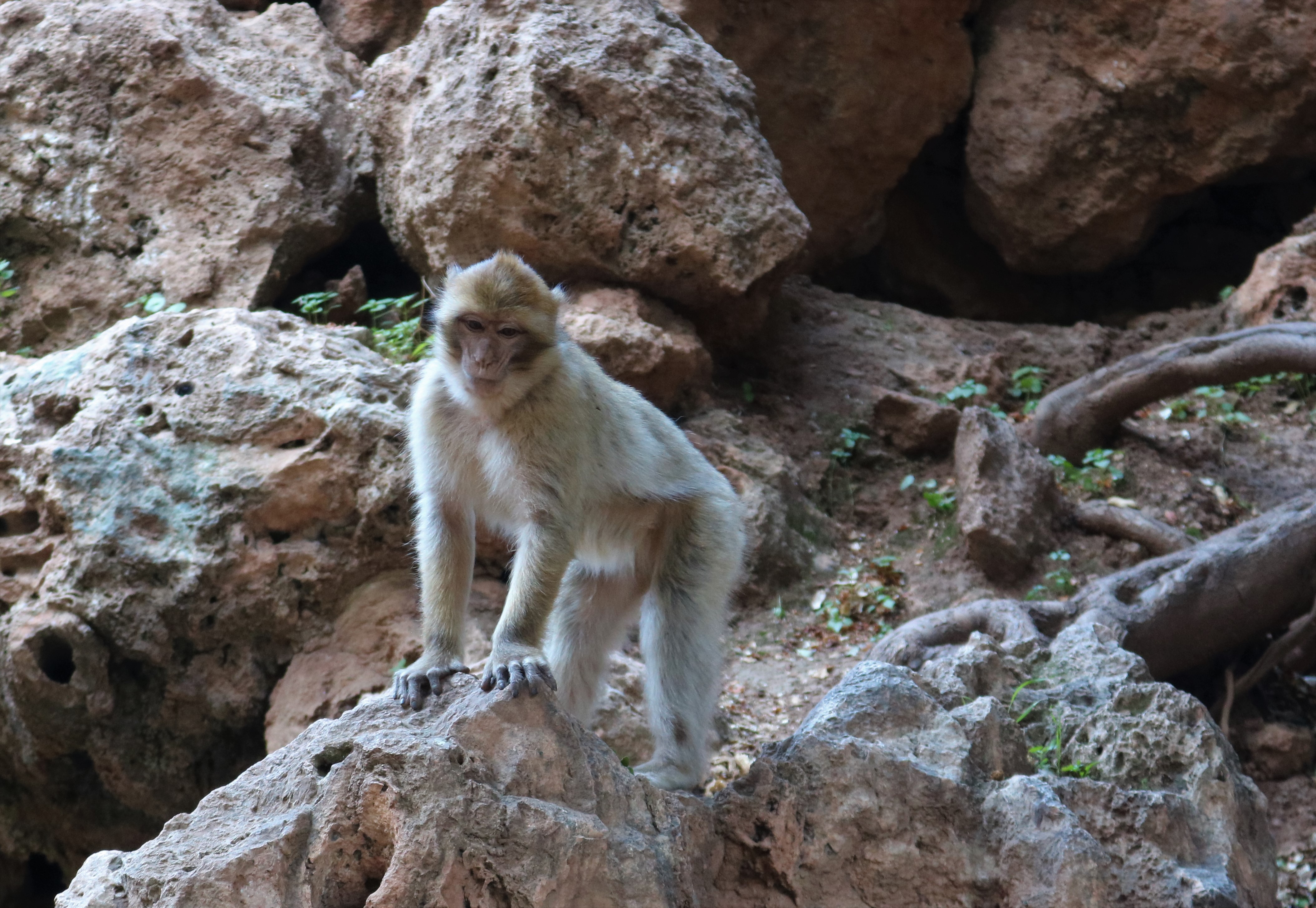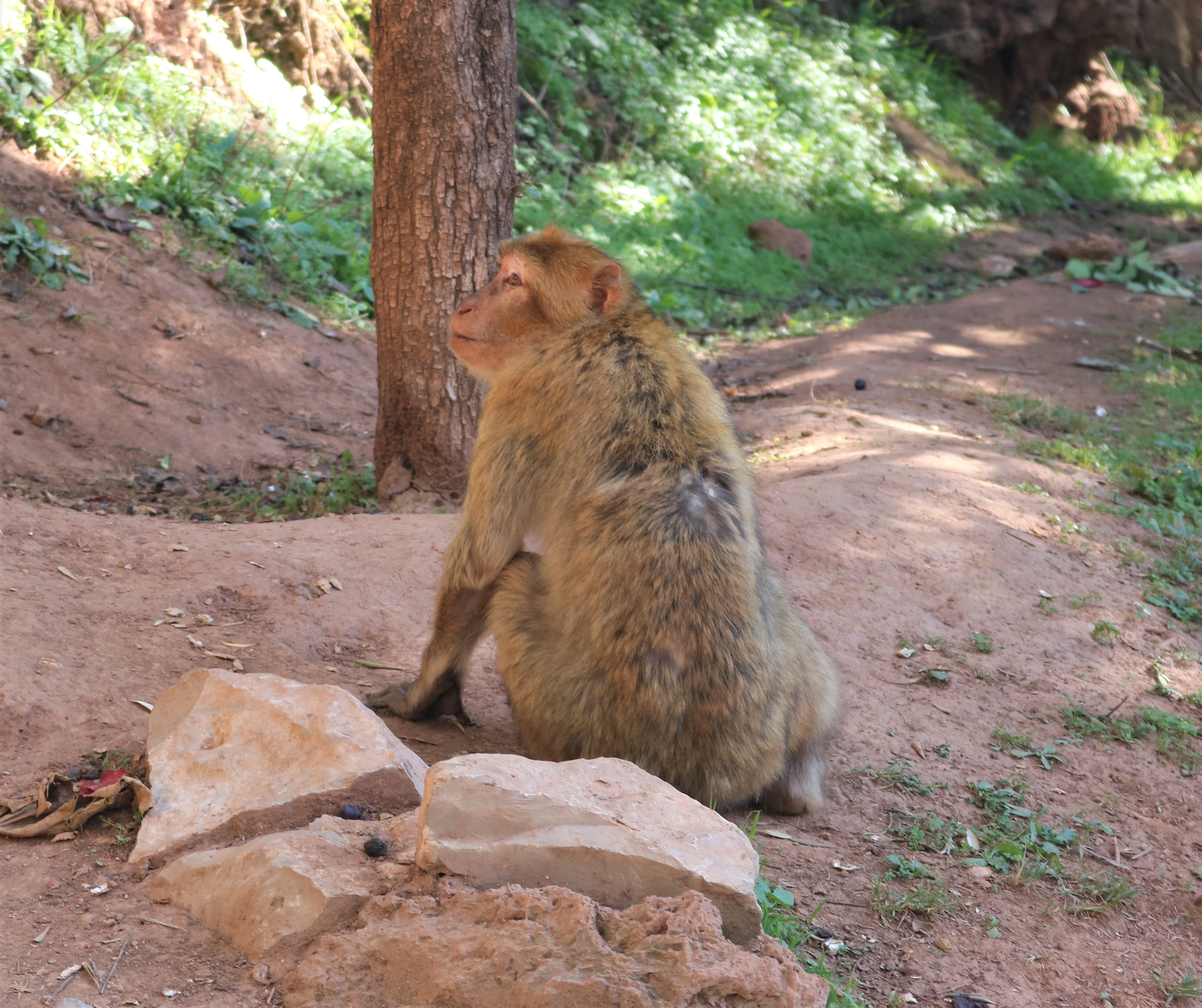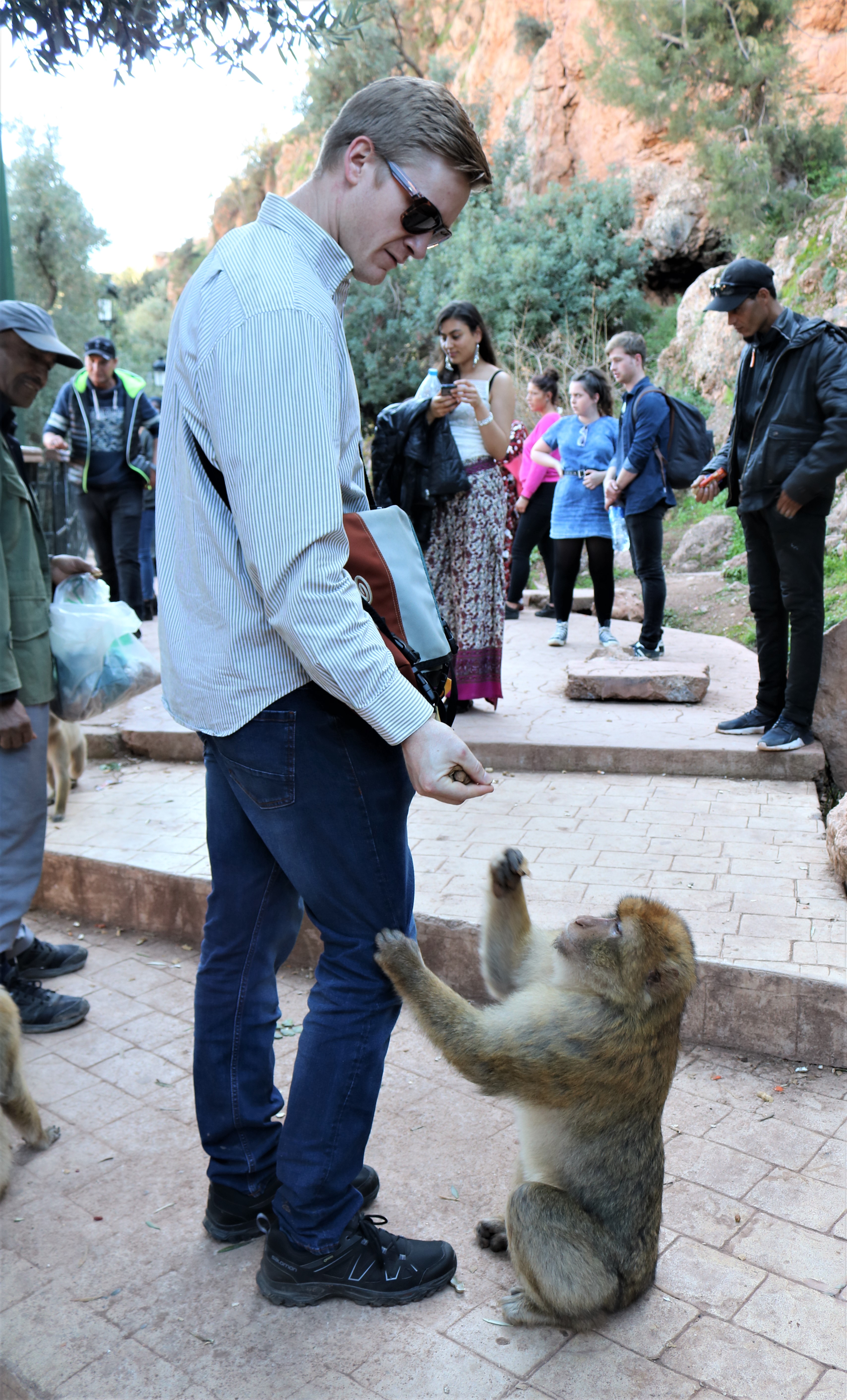 Our day at the falls began with a trek down the hills towards the base of the falls. The trail was a bit uneven and a dirt path. You certainly don’t need hiking shoes, but I wouldn’t wear sandals or flip flops either. We enjoyed seeing the monkeys up close on our journey down the falls. They are friendly, and will climb on your shoulders if you let them. While they will climb on you and appear comfortable around humans, our guide told us not to try and pick them up. Apparently, when tourists try to pick them up they can scratch and bite because they think they are being taken into captivity. These monkeys seem very familiar with humans and were expecting food. Our guide gave them some peanuts to keep them around us. I had brought raisins as a snack for the bus and the monkeys enjoyed eating them. The guide even got them to climb on our shoulders briefly. These Barbary apes are found in the Atlas Mountains of Morocco and Algeria, but sadly are considered endangered as their population is declining. There is a small population of Barbary apes found in Europe – in Gibraltar. Gibraltar is the closest point from Europe to Africa, so they were likely brought over by humans. We found these monkeys to be adorable and sweet, and perhaps even more exciting than the waterfall itself.