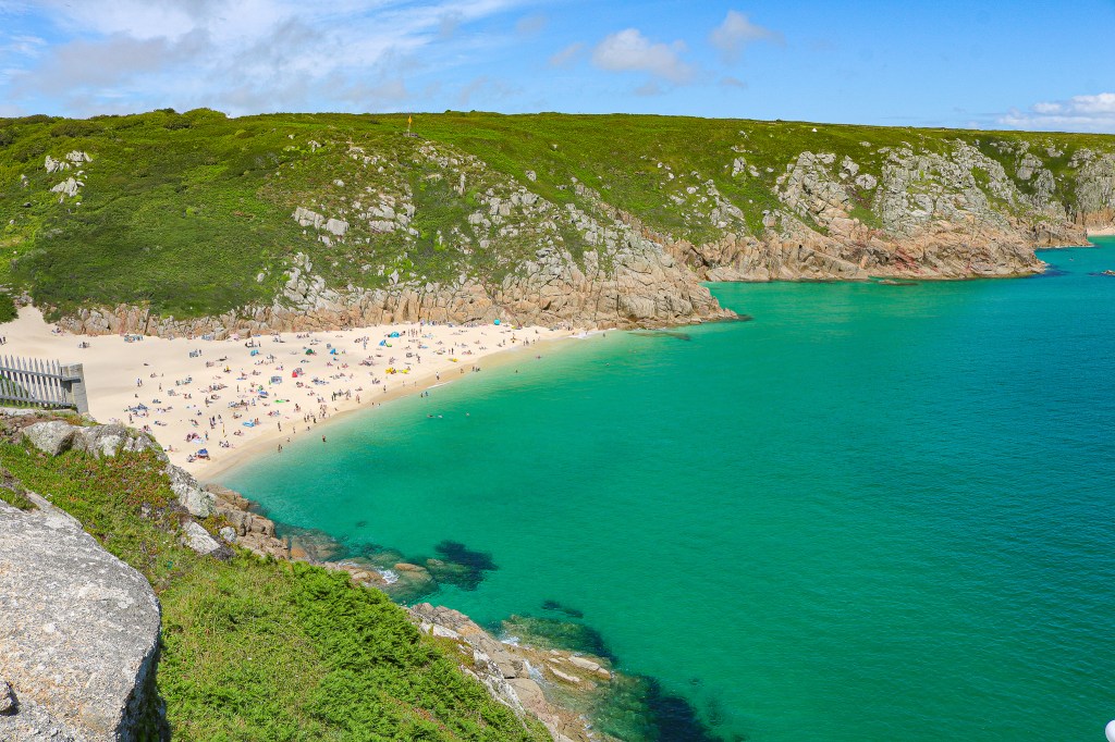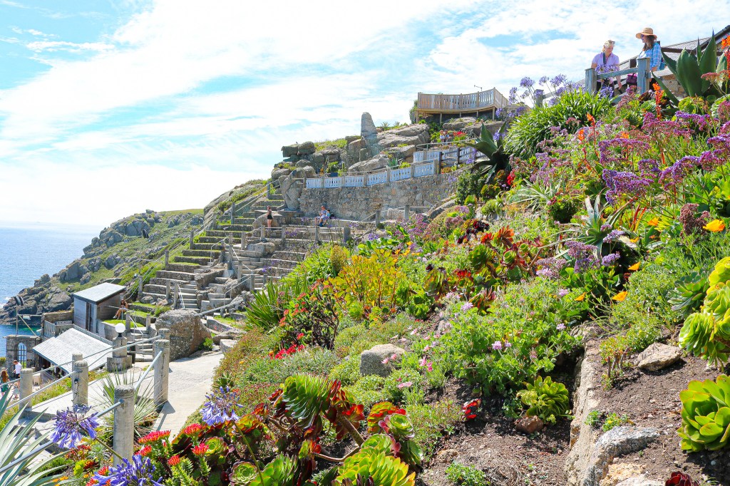 After our beach exploration and hike, we headed back to the loft to grab lunch before the rest of our day. Our next stop was Minack Theatre, about a 15 minute drive from our place (but ridiculously close, it was just a lot of back roads). Minack Theatre is an outdoor theatre that’s built into the hilltop overlooking the ocean. Not only is the view breathtaking, but the gardens in the theatre are beautiful as well. The stone chairs have the names of the plays carved into the rock. The architect was Rowena Cade, who lived in the house near the theatre. She built the theatre circa 1932 for her local theatre group to perform. By 2012, some 80,000 people have come to see performances at the theatre. Due to Covid, there are no performances for 2020 but it would be an amazing thing to see. From the theatre, we were able to enjoy the beautiful views of Porthcurno Beach, with it’s beautiful green water and sandy beaches. Porthcurno Beach is a popular spot, so if you plan to spend the day there, get there early or you risk not getting a parking spot. You could easily visit the theatre, and then take a quick walk to the beach from there.