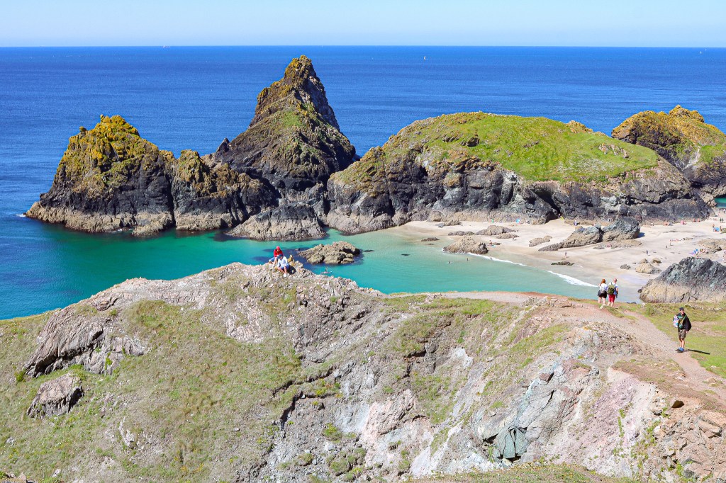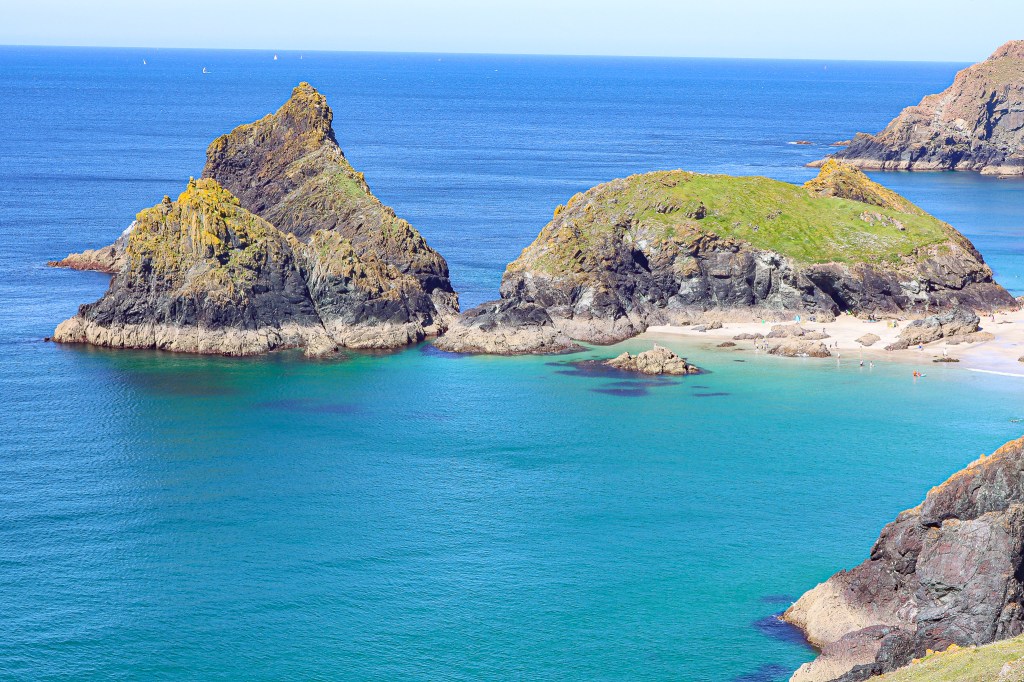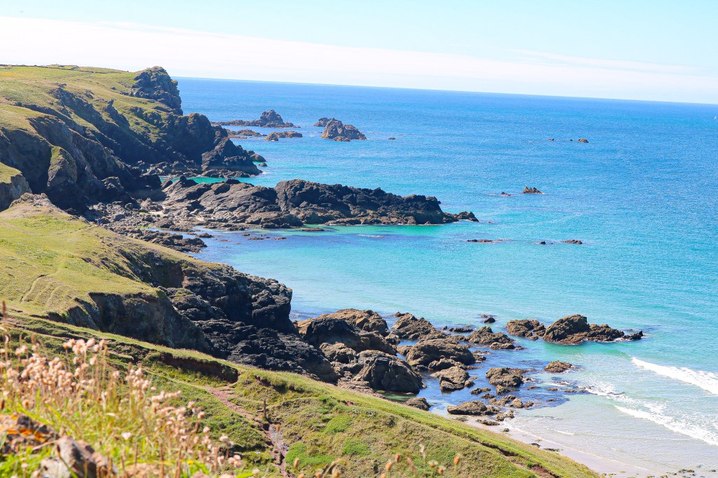 Whenever I plan a trip, there are days I plan too little, and days I plan too much. This was a day I planned too much, and we were on a schedule to fit in all the things I had planned in a certain area, but it was worth it. We spent a lot of time on the “Lizard Peninsula”, which is a specific part of Cornwall that is home to the southernmost point in England. Our first stop was Lizard Point; the parking lot is free to National Trust members and fills up, so get there early. If you are not a member you can park there for a small fee. From the lot, you walk down the steps to the coast, where there is a cafe and gift shop of course. Lizard Point is the southernmost point in England and also has spectacular cliffs and views. From there, we walked the coastal path to Kynance Cove, a little over 2 miles each way. The walk has a few steps and slight uphills, nothing too strenuous. The only reason it took us over an hour to get to Kynance Cove was because I stopped to take so many pictures and we also would give away on the trail for social distancing. People were really good about that, so we felt safe. Kynance Cove is simply beautiful, and I wish we had stayed longer but we had a packed day. This was probably the prettiest hike we did in Cornwall. It was around 11 when we got to the cove and it was already getting crowded, so go early.
