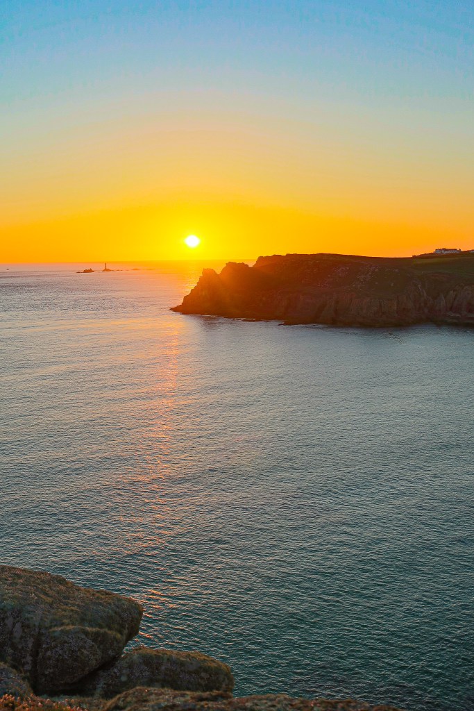 The evening was clear and sunny, so we set out for another hike. We left from Nanjizal Beach and followed the coastal path a few miles to Land’s End. The views were stunning and it was the perfect evening for a hike. I can’t even describe how gorgeous the coast is, and pictures don’t do it justice. There is something so peaceful about being together in nature, with only one or two other people around; it was a nice relief from the crowds in town. I think all this social distancing is something I may prefer to keep up when the pandemic is over. Feel free to continue staying at home! When we got back to the beach, we headed up a steep hill to watch the sunset, as it is not visible from the beach. It was worth the climb, and no words are needed to describe watching the sunset over the water. The coolest thing about? Just as the sun was about dipped halfway below the water, a cargo ship was moving across the horizon, in front of the sun!