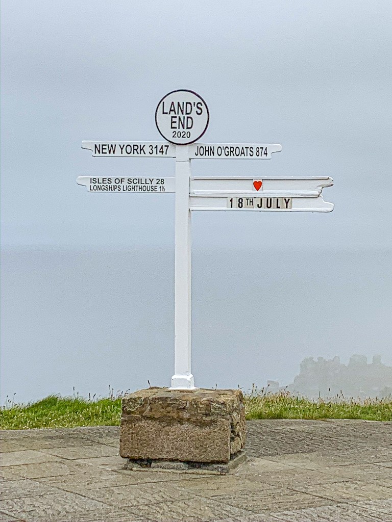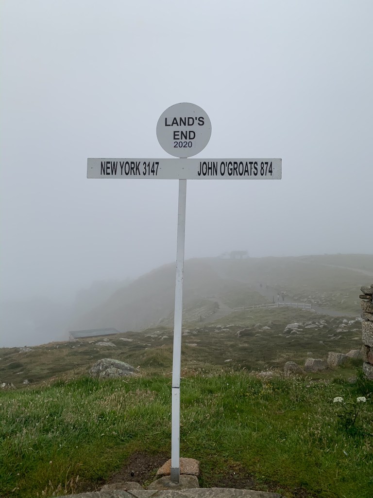 When researching our trip, I realized you could probably spend an entire summer in Cornwall and not get bored because the area is quite large and there is a lot to do. I decided to make our base in Southern Cornwall, and explore that area, saving the middle and northern part of the peninsula for a potential future trip. I don’t know about you, but too often we ping-pong around on these 2 and 3 day trips and don’t get to fully enjoy each spot. I wanted the freedom to spend more time at each place went, without a super tight schedule to follow. I ended up booking an airbnb in St. Levan, which is near Land’s End. The place is called Faraway Loft, and I highly recommend it. It was so adorable and perfect for two people! While arguably one of the best things about travel is trying food in new places, we live in England, so we didn’t need to eat at a pub or restaurant every night. I decided the airbnb would save us some cash AND calories (which were later splurged on ice cream, freaking amazing, more on that later). Our drive down to Cornwall was pretty uneventful, or so I’m told, I slept for over half of it. For some reason, I always fall asleep as a passenger, and I’m not complaining about it. After we arrived at our place, we unloaded the car and headed back to Penzance to grab some groceries for the week. Both Sainsburys and Tesco are in Penzance (about 20-25 minutes from where we were staying) which made it convenient. One thing about Cornwall, the mileage between places might not be much, but it always takes longer than you’d think to drive there because of the narrow back roads; many “two lane roads” require pulling over to let oncoming traffic by. After a quick dinner, we drove over to the Land’s End attraction, with hopes of seeing the sunset, but it was super foggy with little visibility.