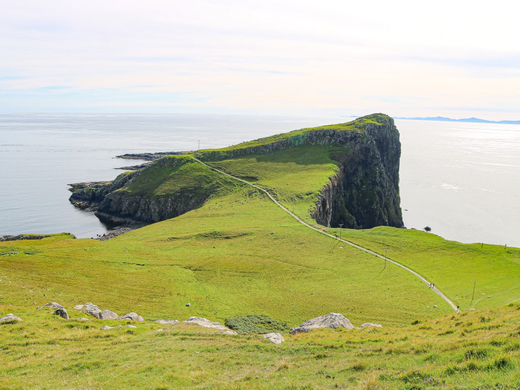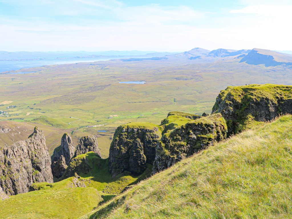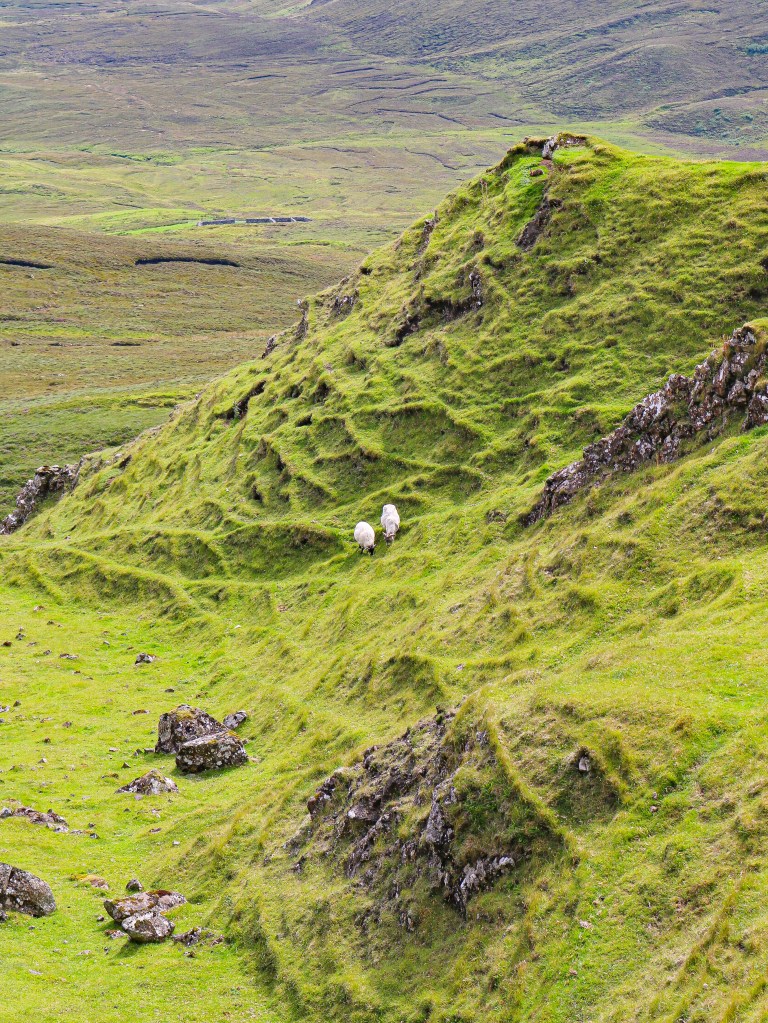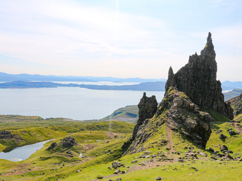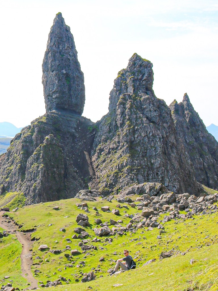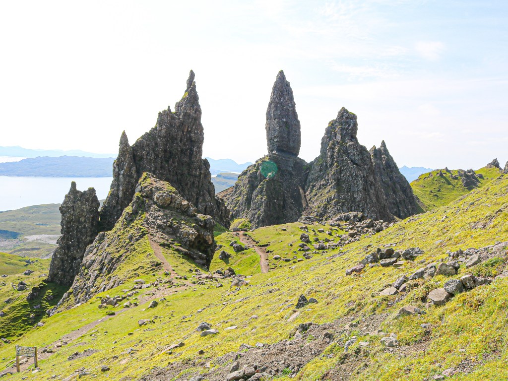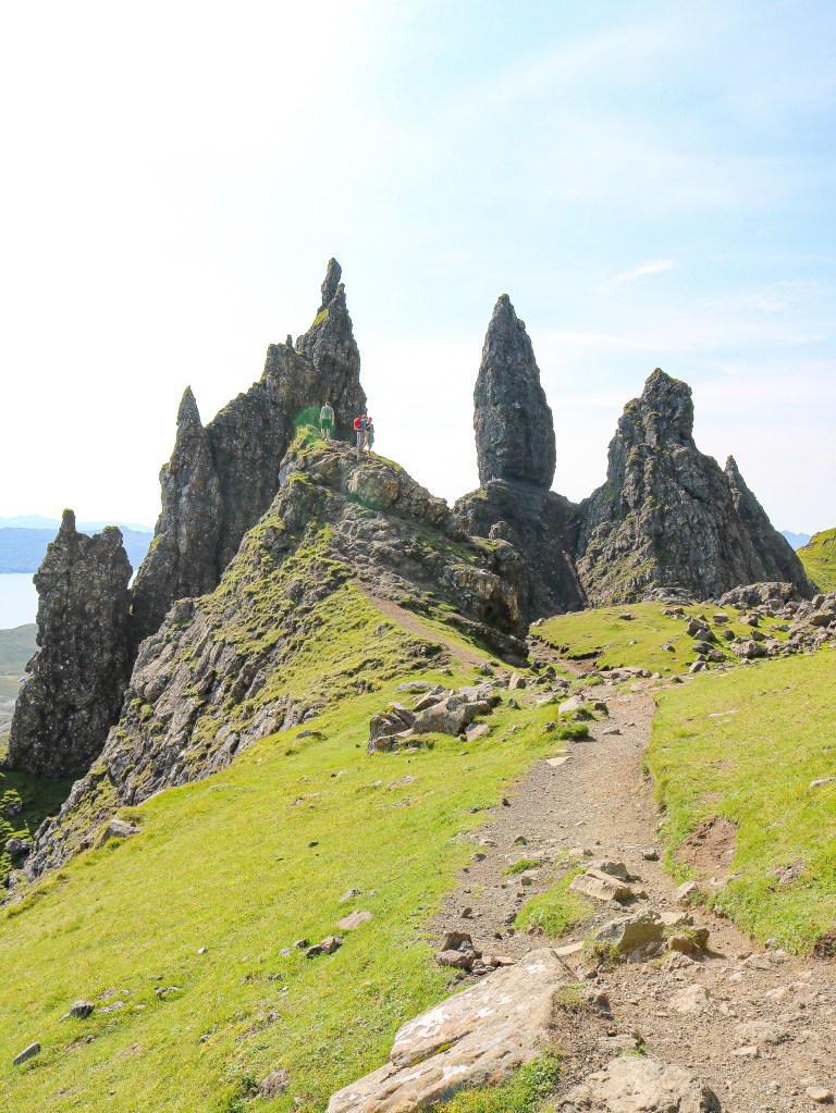 Our next stop was one of the main attractions for visiting the Isle of Skye – the Old Man of Storr. We parked along the road, but it isn’t free, you pay the meter. Old Man of Storr is popular and there is limited parking so arrive early. However, they were building a parking lot while we were there, so perhaps it is completed. We spent about 2 hours there. My legs were sore from a previous hike we did in the Highlands, and the walk is all uphill, so I took it slow, and stopped for a billion pictures. I also struggle immensely with downhills; they kill my knees so I take a while to go down steep hills. The Old Man of Storr is an iconic spot of Isle of Skye, and widely photographed (helllloooo, Instagram spot!). It’s truly beautiful, and I can’t imagine it in other seasons! The “Old Man” is a large pinnacle rock that sticks straight. The rock formations you see up on the hill are incredible, and the area overlooks the Sound of Raasay, and the Isle of Raasay (another of the Inner Hebrides Islands). The route is heavily traveled by tourists, and the walk is quite easily to figure out – you basically keep walking up. Follow the dirt path, go through the gate, head towards the rock formations, and you’ll be fine. Basically, keep going UP. I’m not very good at directions, am I? We saw a family with a cute little girl dragging behind. She was walking it in rain boots; I don’t recommend that – she was crying and it looked uncomfortable (it was also unusually hot and sunny that day). Anyhow, her wellies (what we call rain boots over here) were pink and glittery and had Elsa from Frozen on them. All I could think was, she insisted on wearing them, because toddlers do what they want, and her parents were picking their battles. When I turned around about 5 minutes later, I saw they were carrying her. So who really won that day?? Wearing wellies never entered my mind, but I was glad I brought my hiking boots. If you don’t have proper hiking boots, you’ll be fine in sneakers. As always in Scotland, there are sections that are wet and muddy. The view is worth it though!