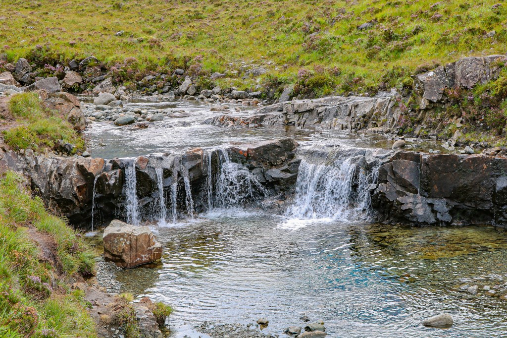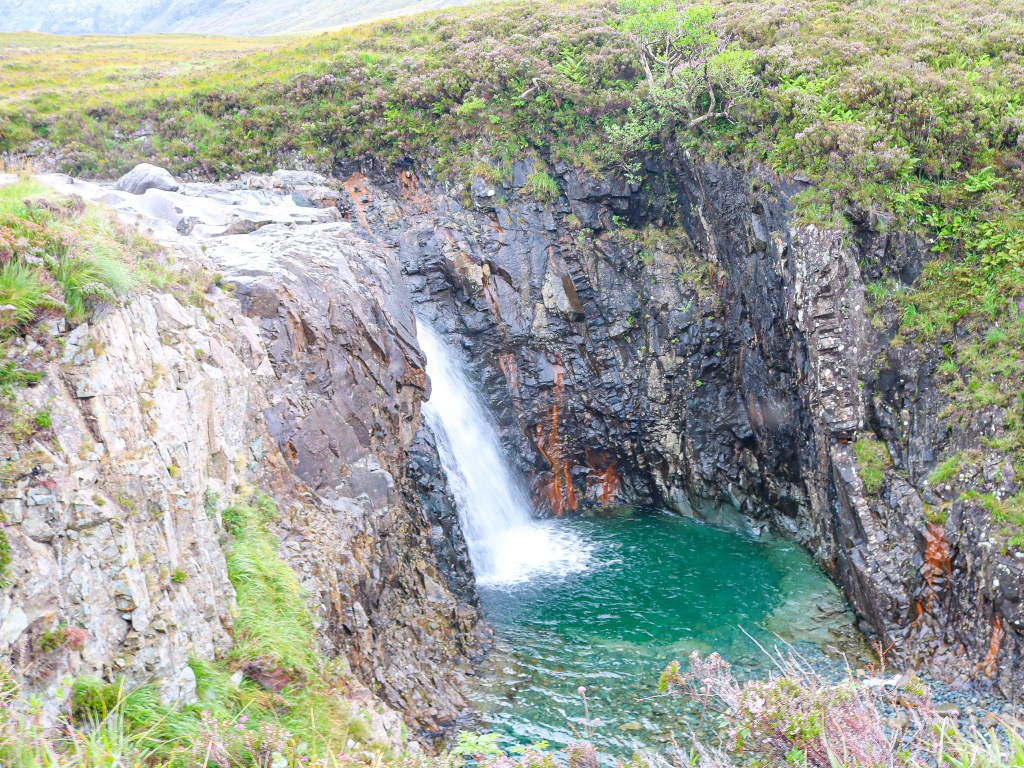 Our second day on Skye we had a few stops planned, and took us to different parts of the island. We wanted to start our day at the Fairy Pools. This is one of the most visited places on Skye. Unfortunately, it was a rainy and overcast day, which was not ideal for seeing the colors in the water. But, our time on Skye was limited so we went anyhow. The visibility was poor during the hour drive, but I’m glad we stuck it out, because the rain cleared up when we arrived. It was still overcast, but better than rainy. The Fairy Pools have a HUGE parking lot, bigger than anything else I’ve seen on Skye, but you do have to pay for parking. The walk starts across the road from the parking lot, and other than the initial hill, it’s fairly easy. As you head along the path, a series of mini waterfalls and pooling water awaits you. The were pretty, but I imagine much better in the bright sunlight. The view of the Cuillins Mountain ridge in the background was spectacular as well. One thing we weren’t prepared for is how brutal the midges are there. Midges are some Scottish pest, similar to gnats or mosquitoes and they swarm around. It was insane, and even our midge repellant wasn’t working. We had seen pretty walking back (its and out and back) wearing nets over their heads. At the time it looked odd and we laughed, but we quickly discovered they were smart. I ended up putting my mask on to keep from breathing them in, it was THAT bad! As a result, we didn’t spend as much time there as originally planned, nor could I get the pictures I wanted because the midge swarms were everywhere. Hopefully when you go, it won’t be as humid and there will be less bugs.