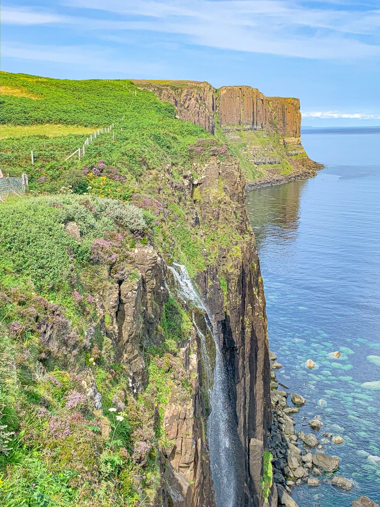 Our next stop was a popular Skye attraction – Kilt Rock and Mealt Falls. Again, there is a carpark, but it did get quite crowded. I imagine in a non-pandemic year, there would be even more visitors. I know some cruise ships stop at Isle of Skye, and I’m so glad we were able to visit the island without thousands of additional tourists. Anyhow, the waterfall is right next to the carpark, and as you look to the left, you’ll see Kilt Rock. It’s named that because of the way the flares out. It also has grooves in the rock, and it looks like a pleated kilt. Kilts are so very Scottish, so this name seemed appropriate. Kilt Rock and Mealt Falls are along the Sound of Raasay, looking out over the Isle of Raasay. The waters are known for their wildlife such as dolphins, whales, puffins, and other birds. Normally you can take boat trips to view wildlife, but these opportunities were quite limited due to Covid. We tried our best to spot some wildlife, but sadly did not see anything. I’d like to go back to Scotland and visit the Inner and Outer Hebrides, and take a whale watching trip.