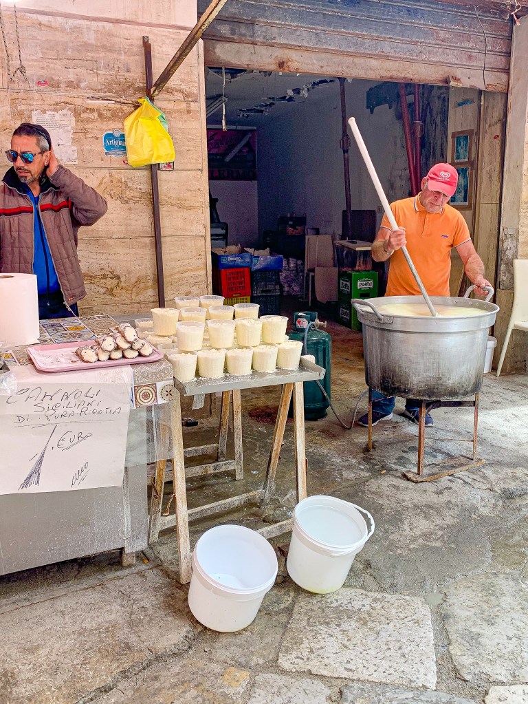 Let’s talk about the important stuff! Food and wine is what comes to mind when most people think of Italy, and I’m no exception! Growing up, we had access to many Sicilian specialties – some homemade and others from local cafes. One of the most well known Sicilian desserts is the cannoli. This was my favorite growing up, and I still love them! They can be found EVERYWHERE in Sicily, especially Palermo. You will find cannolis at the markets, restaurants, and bakeries. Two of the best places to get cannolis are the Ballaro Market (we even saw them making fresh ricotta on site!) and the Santa Caterina Monastery. There can be a line at times, but it is worth the wait – everything is fantastic and you can sit out in the garden to eat.