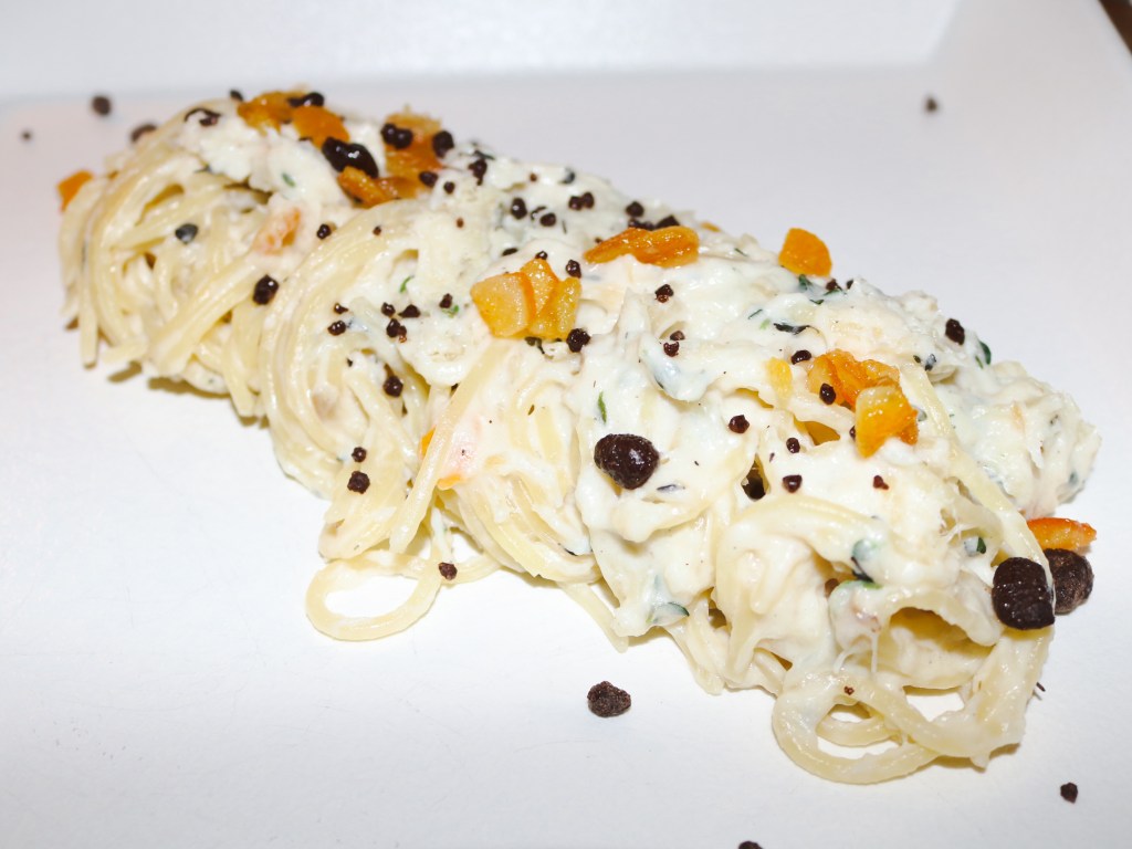 fresh linguine with cod, chocolate, and candied oranges
