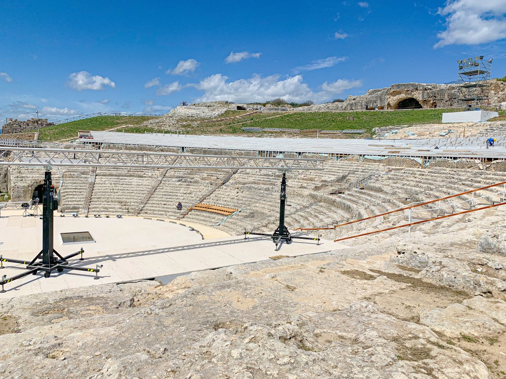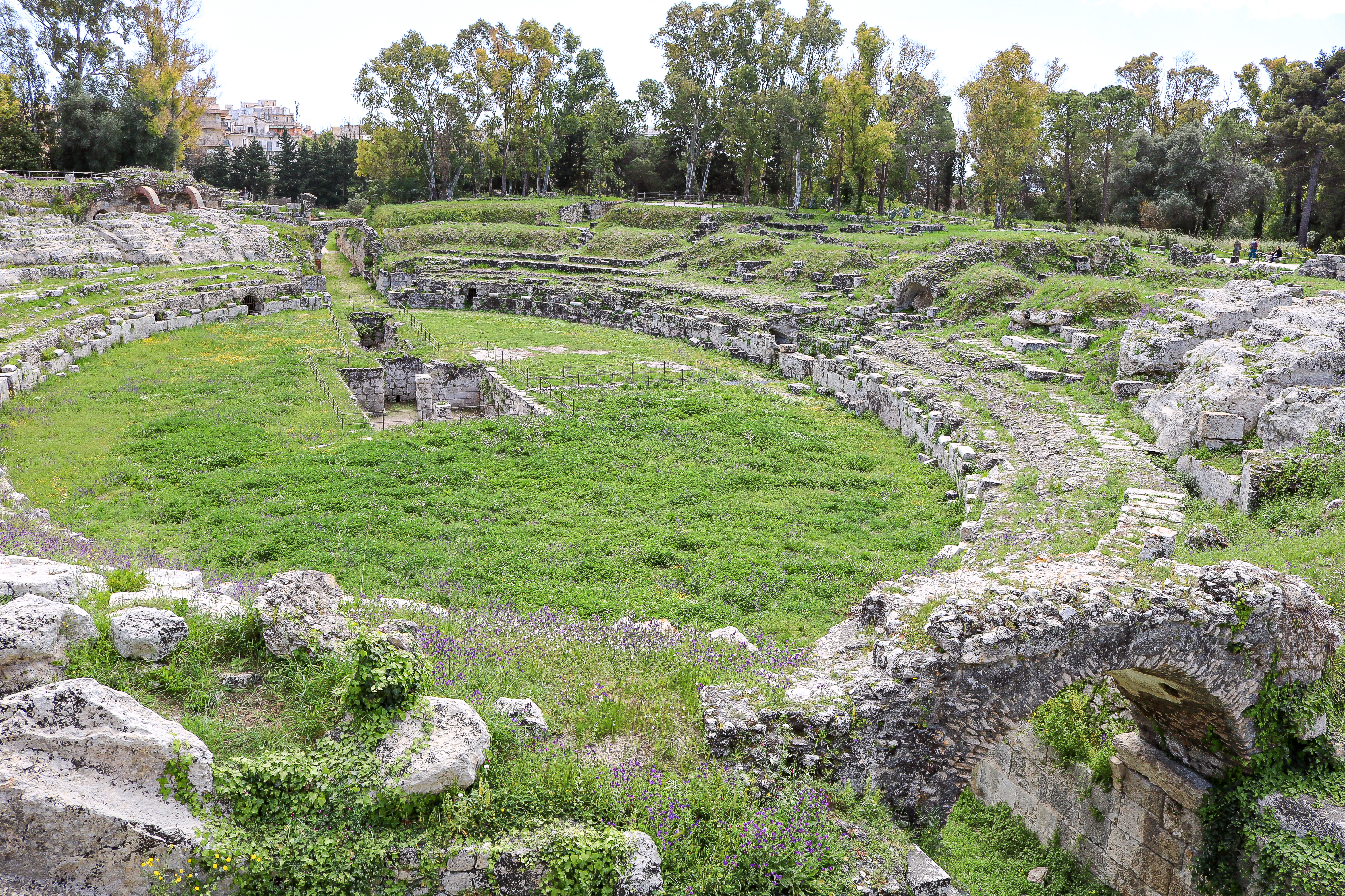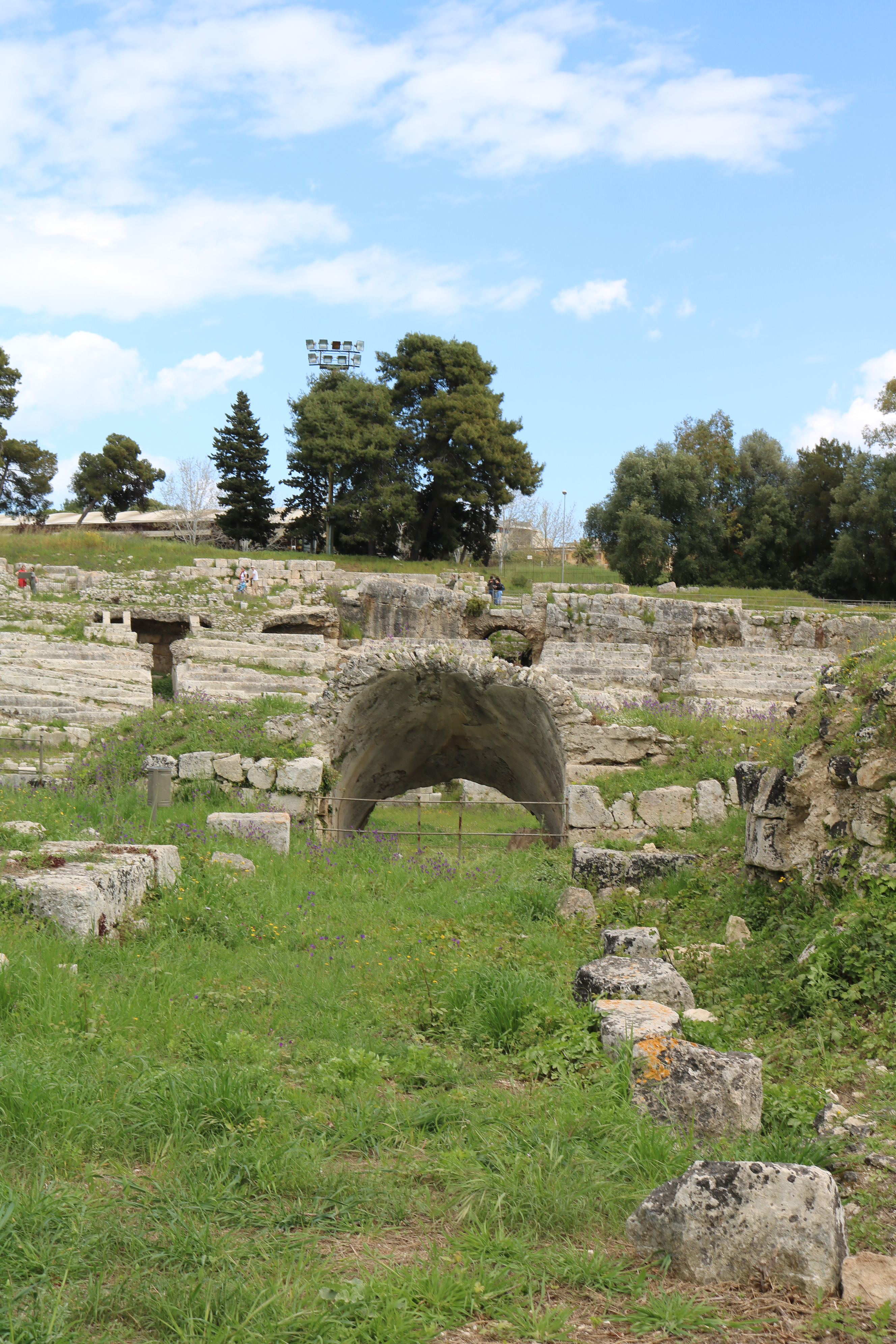 A main attraction of the archaelogical park are the ancient theatres – and there are two, one Greek, and one Roman! If you continue on the path from the Ear of Dionysius, you will reach the Greek Amphitheatre. The area was under renovation when we visited, but you can still see the theatre. From the top, there is a beautiful view of the sea! This ancient Greek Theatre is considered one of the best examples of architecture as it was carved into the rock. It was used for hundreds of years before being left to ruin. During the 16th century, stone from the theatre was taken by the Spanish explorers. The theatre was undergoing renovations when we visited, but you can still see it and walk around.