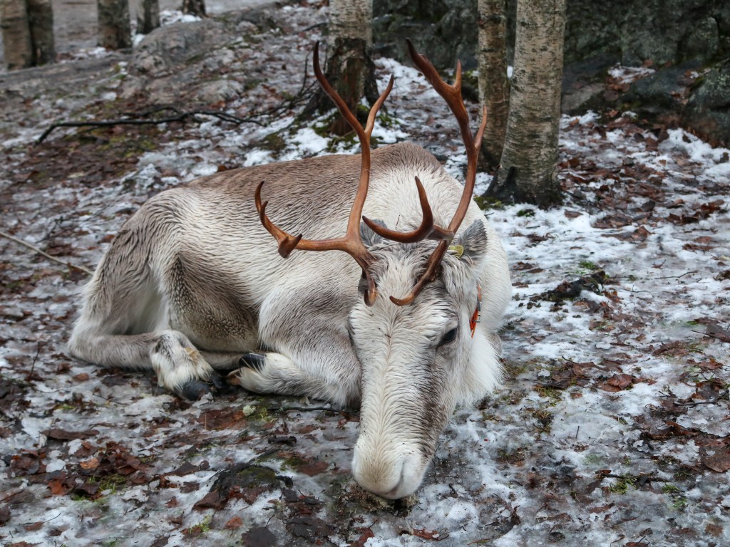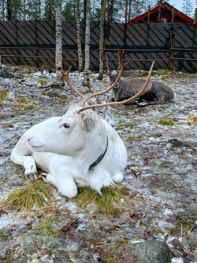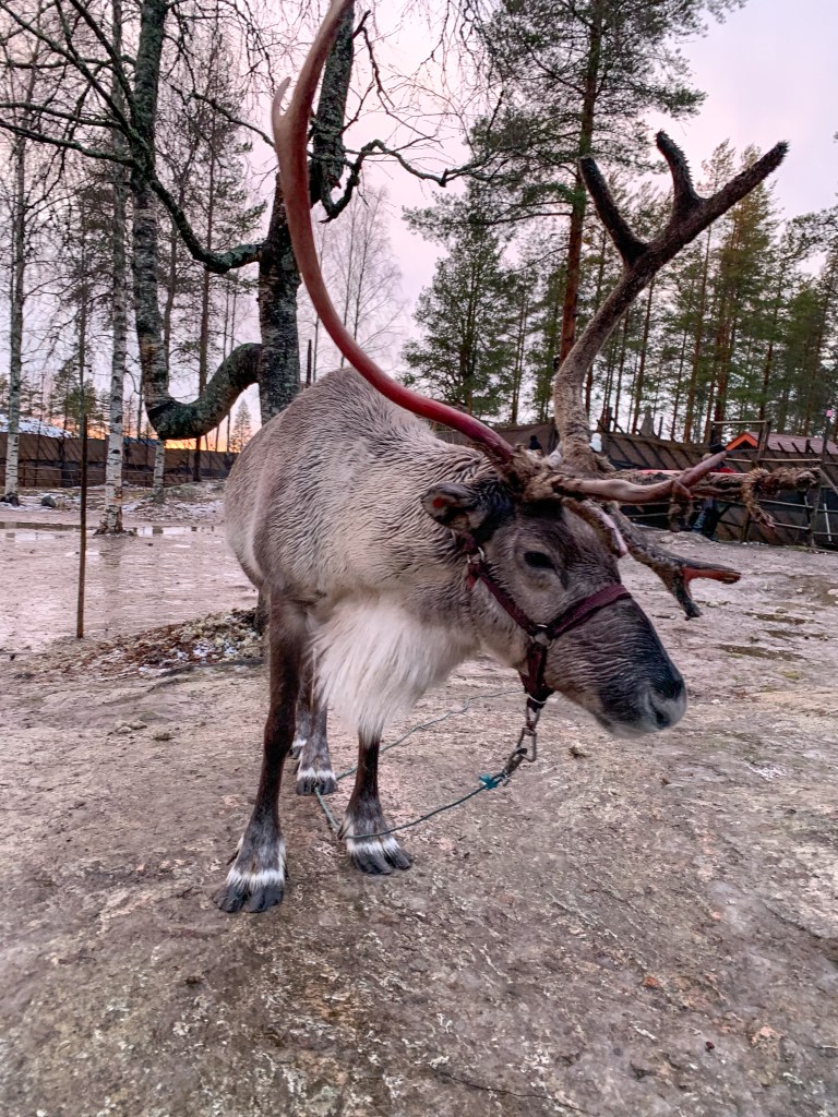 One reason we stopped at Santa Claus Village was to see the reindeer. For 5 euros a person, you can enter the reindeer enclosure, learn about the reindeer from their caretaker, and feed them. There several reindeer we got visit with and “pet”, all of varying sizes and ages. We even saw a baby reindeer, which was of course the cutest thing ever! He had one antler, so he looked like a unicorn. The reindeer were all friendly and used to being around people. The people working with them will also take pictures for you. These reindeer were the sweetest and we had so much fun with them. This is one of the few inexpensive outings you can do in Rovaniemi and Santa Claus Village, so don’t miss it!