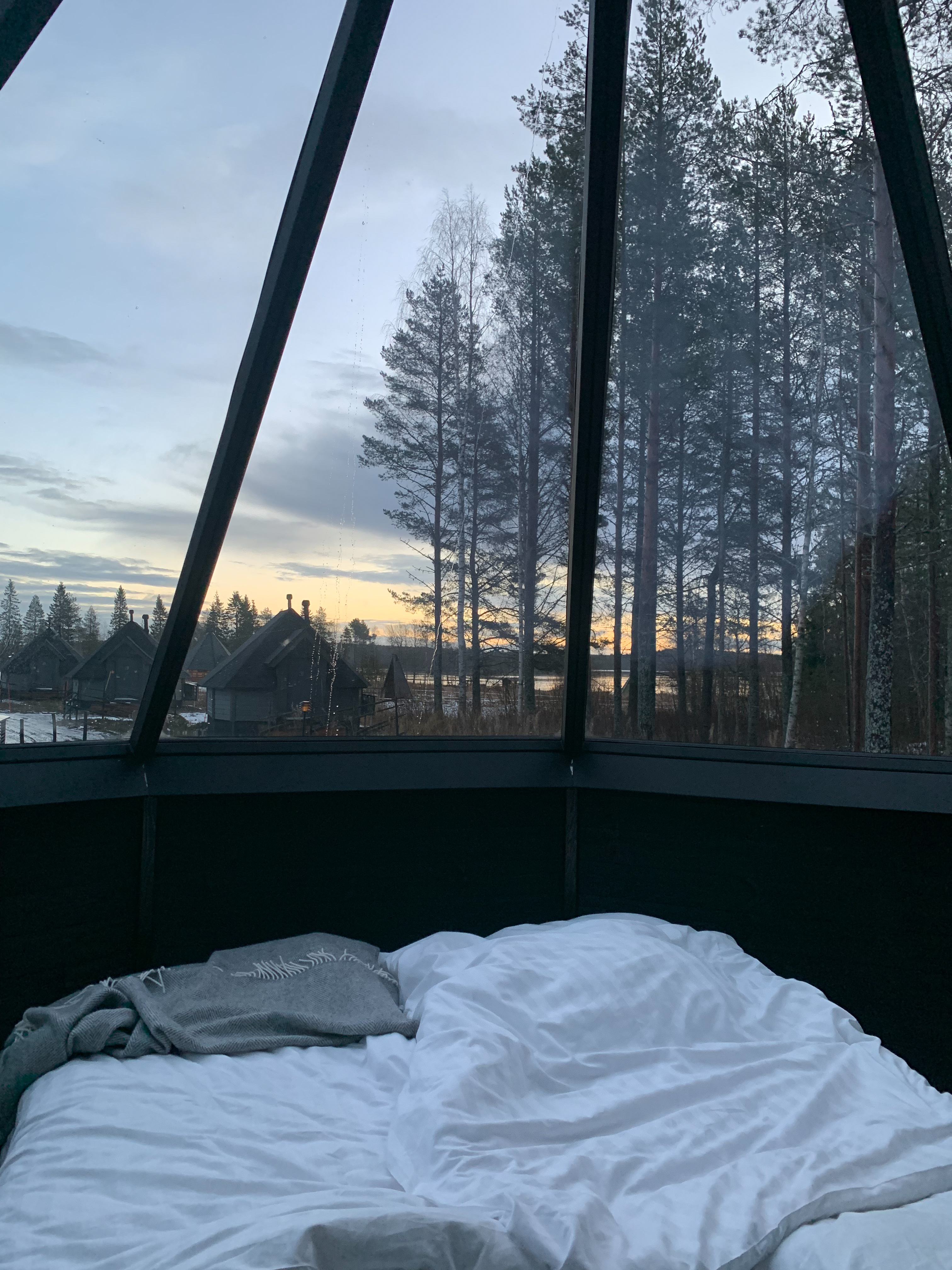 Once we had flights, it was time to book a place to stay. Turns out those full igloos you see circulating on social media are super expensive. We are all for a splurge every now and then but 700 a night was out of our budget, especially since we like to travel monthly. I did find the perfect alternative, which was not only incredible, but more affordable. We stayed at Apukka Resort in one of their Aurora Cabins. These cabins were half glass, with the bed facing a glass wall/ceiling. They were also equipped with a full bathroom (with floor heating), a mini fridge, and a couch. Lo and behold, we saw the Northern Lights on our first night, from the comfort of our cabin! Our stay included a massive breakfast spread that was so delicious, and an Aurora Alerts app to use during our stay.
