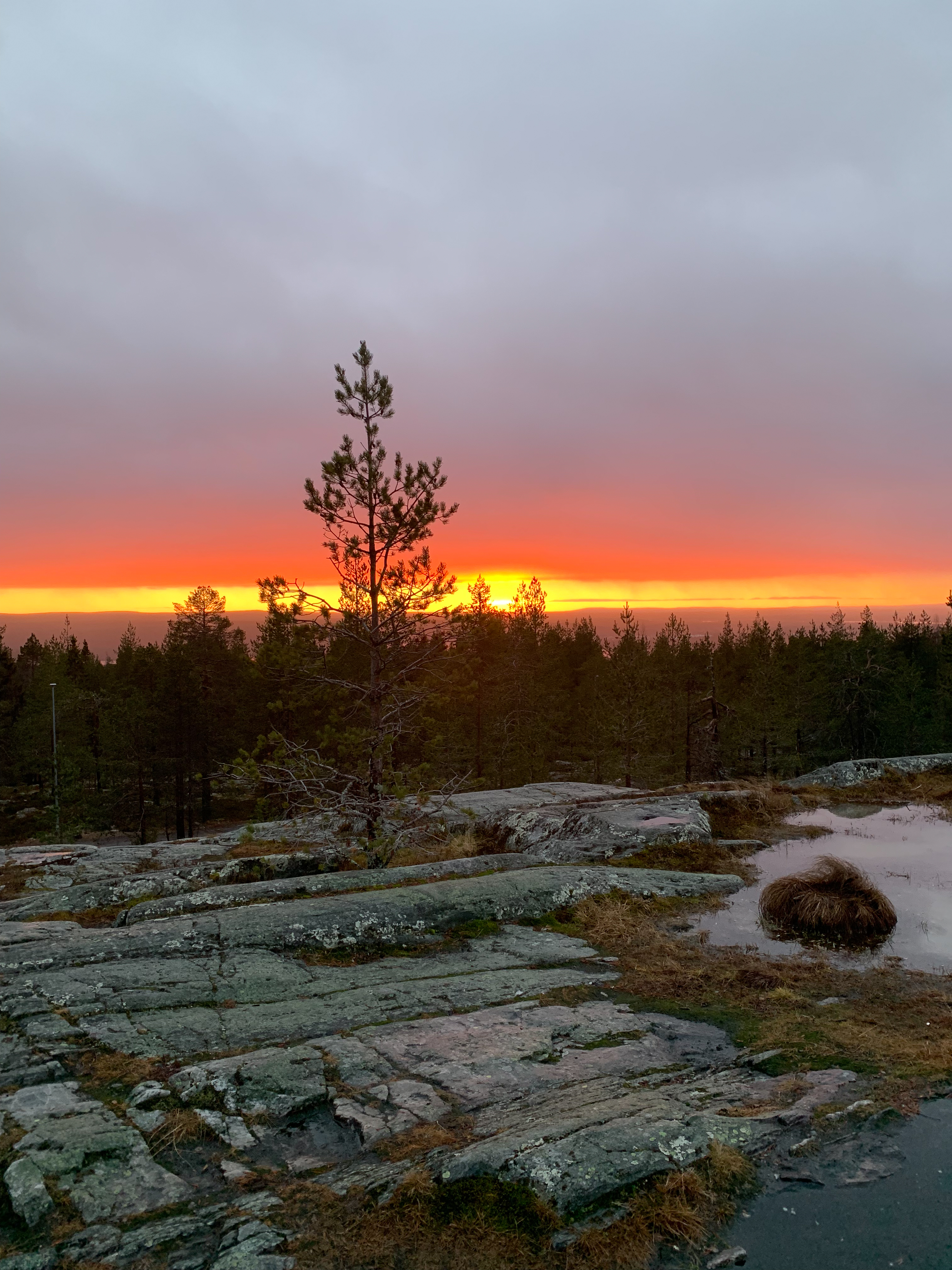 I had hoped for more snow (well, any snow would have been great). I wanted a Winter Wonderland, but mid November was too early in the season to deliver. Luckily, a nearby recreation center called Santa Sport, had some snow made for cross country skiing. I grew up cross country skiing, and even raced a little in high school. It had been about 20 years or more since I’d been on skis, but it was just like riding a bike. We were able to rent the skiis from Santa Sport, and then drove over to the track to ski. My husband had never cross country skied, and he likely won’t ever do it again. He described it as “the worst, because it is hard AND boring”. I quite enjoyed myself! I can only imagine what it would be like to ski around the entire complex in mid winter when there is actual snow! After skiing, we headed to the highest point in the park to watch the sunset. There’s a short path up from the car park, and you are treated to an orange ski. Sunsets in the Arctic Circle are magical! It looks like the sky is on fire!